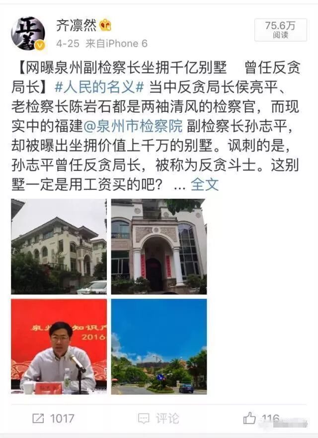 除此之外,一名自称是“孙副检察长32年老同学洪志强”的人,在网上以《泉州住别墅检察长再遭老同学爆新料》为题,曝出“住别墅检察长充当‘校霸’贪官的保护伞”问题。