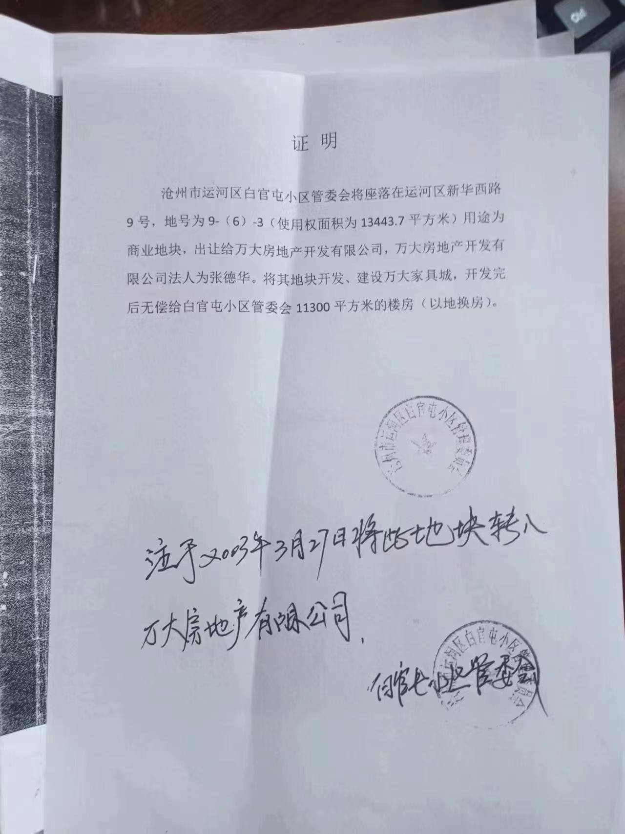 他说,滋事方是万大家具城的物业管理人员,是原沧州万大房地产开发有限公司的法人张德华及其他四五个人。对方表示,二十多年前,这里同时开发建设了两栋楼,一栋是刘宝龙租的这栋,开发商名叫刘东亮;另一栋是他们万大房地产开发有限公司开发的万大家具城。他们声称,刘宝龙的门市门口及太平洋保险公司门前有几分地是属于他们的,是私有财产,刘宝龙他们无权使用。为了让刘宝龙相信,他们还拿出一张盖有白官屯小区管委会的土地转让证明,上面标注:地号9-(6)-3这块地于2003年3月27日转入万大房地产有限公司。也正是手拿这份证明,他们不仅将整个大楼的两个出口牢牢堵死,甚至放出话来,如果还想继续使用门前这块地,那就必须对他们做出一定的经济补偿。