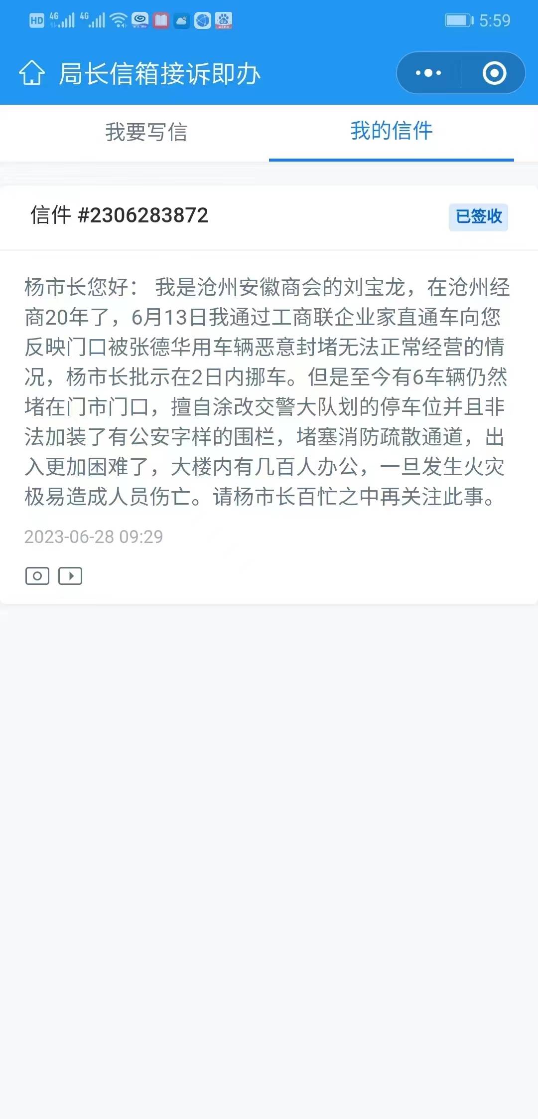 刘宝龙说,从5月17日到现在,已经快两个月了。让人无奈的是,闹得半个沧州市沸沸扬扬的这起堵门事件,当地有关部门的不作为让他感到坠入深渊般的恐慌和无助。他们向所有该管的部门都反映过,然而却没有一个部门来过问此事。一个小商贩路边卖点菜,城管立马就来管,张德华在繁华主城区的主街道围堵两个月,城管却不管不问;已经明显涉嫌寻衅滋事和破坏生产经营犯罪,而且还用涂着公安字样的 围栏,这种已经完全无视人民警察的恶劣行径,当地公安机关却一次次选择了沉默:在张德华他们公然围堵大楼门口的时候,无论是城管还是公安,执法人员当时虽然都在现场,可惜却没有一人出面制止。本该依法维权的执法人员依靠不了,刘宝龙便通过拨打市长热线等方式以求解决问题,但没有任何结果。刘宝龙自嘲道,近几年沧州市政府在媒体上多次表示,采取积极措施大力优化营商环境,浓厚重商、安商、暖商的氛围,构建企业家直通车制度,努力为中小企业纾困解难,然而自己作为沧州安徽商会的副会长,多次向有关部门反映,问题还始终没人来过问,何况一个普通的商户呢。面临这种车堵拦截的困境,让刘宝龙对沧州的营商环境有了新的认识。