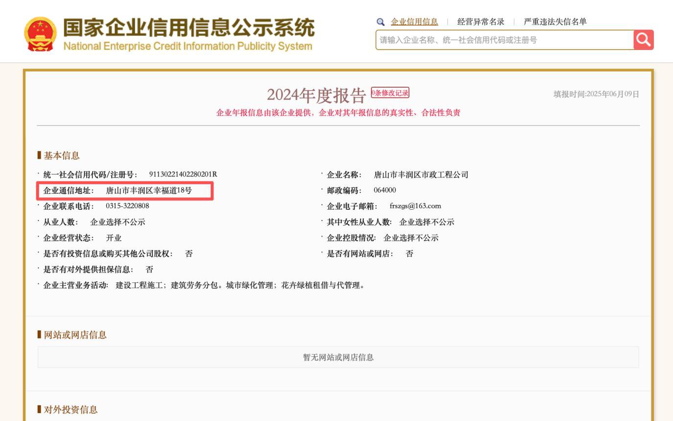 值得注意的是,招标人的工商住所为河北省唐山市丰润区幸福道18号,中标人的工商登记地址为“幸福道20号”,看似相近不相同。其,中标人在2025年6月9日填报的2024年度报告显示,企业通信地址同为唐山市丰润区幸福道18号。