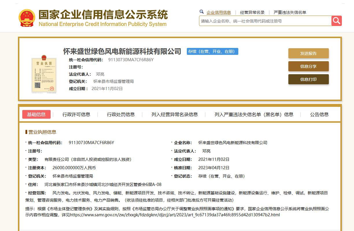 国家企业信用信息公示系统显示,怀来盛世绿色风电新能源科技有限公司成立日期为2021年11月2日,法定代表人为邓亮,经营范围包括风力发电、光伏发电、风力发电、储能、新能源项目开发等。住所为河北省张家口市怀来县沙城镇河北沙城经济开发区管委会6层A-08。
