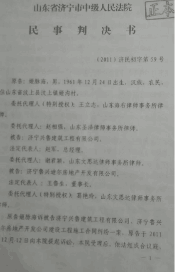 编者按:山东济宁鲁兴迪尔、兴鲁两家公司恶意拖欠巨额工程款不付,受害人诉诸于法院居然得不到支持一事,经媒体陆续曝光以后,在社会上引起强烈的反响。济宁市中级法院负责纪检的某纪检书记特地就此案件主动打电话给受害人姬脉海,承认此案件当时在办理审理过程中确实存在瑕疵与不公的地方,希望姬脉海能够理解他们办案人员的难处,要顾全大局,理性上诉、申诉。并称,他们也不希望出现这样的结果,但是,现在他们也没有权利改判该案件了。建议姬脉海继续就此案件上诉、申诉至山东省高院或者是最高人民法院,以求得到重新改判。憨厚的姬脉海他现在认的也就是一个死理:山东济宁鲁兴迪尔公司两栋楼房是他姬脉海自己垫资1000多万并带着他的一帮农民工兄弟帮助建起来的这个事实是永远存在的,也是任何时候任何人都休想更改的铁的事实。当初为了承包这个工程,早在签订合同之前,姬脉海便向对方预先交付了43万元工程建设保证金。现在房子已经建成并且通过验收交付使用,对方就应该无条件的支付给他应该得到的工程款、垫资款和当初交付的工程质量与工期保证金。我们是受害者,对方恶意拖欠我们农民工工钱不付,我们诉诸于法院,为什么得不到法律的支持!山东两级法院判决我们败诉的法律依据是什么!!建筑经济承包纠纷为什么不按照《建筑法》判案!合同经济承包纠纷为什么不按照《合同法》判案!行业标准规范经济纠纷为什么不按照行业标准规范判案!建筑工程建筑面积纠纷为什么不依照《建筑工程建筑面积计算规范》判案!工程量清单计价规范纠纷为什么不依照《建设工程工程量清单计价规范》判案!《建筑工程质量管理条例》纠纷为什么不依照第十条第一款规定及第78条第1,2,3,4条规定判案!民事诉讼经济纠纷,为什么不按照《民事诉讼法》判案!依法治国,法在那里?合同约定国家法律行政法规文件办法标准规范规定不管用不合法。而被告套用国家废止无效建筑面积规则合法管用!合同反反复复约定标准规范不管用不合法!而被告“固定总价”严重低于当时市场价格及低于合同约定国家标准规范规定价格合法管用,一审胜诉,没有胜诉的交待;二审败诉,又没有败诉的说明。甚至连他当初交付的工程质量与进度保证押金43都不提及了。这叫什么依法治国!我们这些农民工不是义务学雷锋做好事免费为对方建楼房的。姬脉海诉山东济宁鲁兴迪尔、兴鲁两家公司恶意拖欠工程款案件,被错判、乱判直至最终被法院判决败诉,它所凸显出来的不是一般的社会问题,而是让人们感觉到当今社会司法腐败已经到了非常可怕的严重地步了----