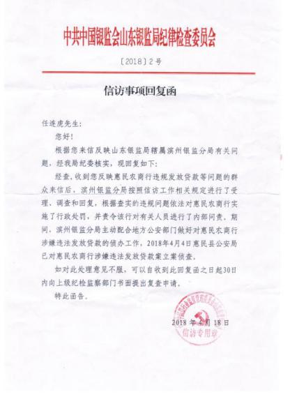 2016年12月23日,为维护惠民县民营企业金融环境,任连虎实名向滨州市银监局、山东省银监局、中国银监会、滨州市经侦大队、山东省经侦总队等部门反映原农商行行长刘伟向关系人多家空壳公司违法发放过亿贷款侵占客户资金的违法情况。滨州市银监局、山东省银监局分别给出的信访事项复查意见书均是包庇纵容;任连虎向中国银监会投诉惠民县农商行违法违规事实,2017年6月12日,中国银监会信访答复意见书结果满意。但却未得执行,惠民县农商行依然向违规企业违法发放资金。