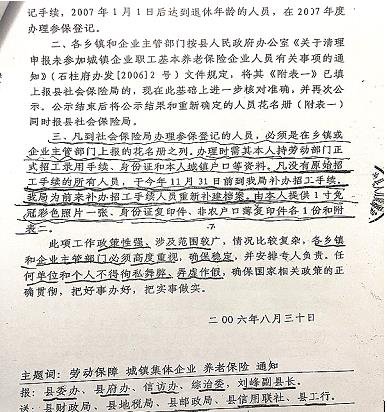 “该判决为终身判决,且法院也就该问题向石柱县人社局转递了司法意见。93年以前,劳动法尚未实施起来,当时的招工手续均保存在政府保管,导致手续的无法提供“”冉启林说“”作为个人我们也无能为力,其实早在2006年8月30日石劳社文【2006】115号关于城镇集体企业人员参加养老保险有关问题的通知中,人社局就意识到这个问题的存在,也在该文件中阐明了解决办法,文件中明确表示“凡没有原始招工手续的所有人员,于今年11月31日前到我局补办招工手续,我局为前来补办招工手续人员重新补建档案“”