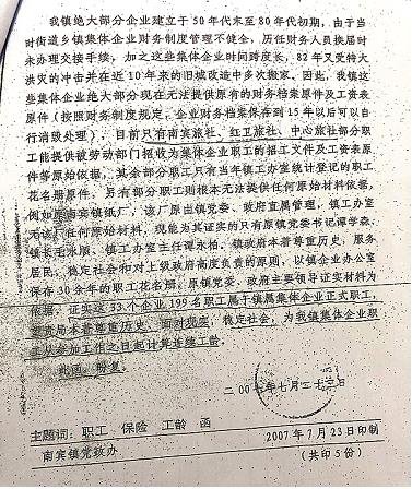 2007年7月23日,石柱县南宾镇政府也就上述情况向石柱县人社局发函(南宾府文【2007】226号),称“”关于南宾镇集体所有制企业职工补交社会养老保险费后计算连续工龄的问题,表述称“该镇企业多建立于50年代末至80年代初期,由于当时街道乡镇集体企业财务制度管理不健全,历任财务人员换届时未办理交接手续,加之82年又受特大洪灾的冲击并在10年来的旧城改造中多次搬家,因此我镇这些集体绝大部分现在无法提供原有的财务档案原件及工资表原件。并证实冉启林等人确系镇集体企业的正式职工,并希望人社局本着尊重历史、面对现实、稳定社会”的角度给予从参加工作之日起计算连续工龄。
