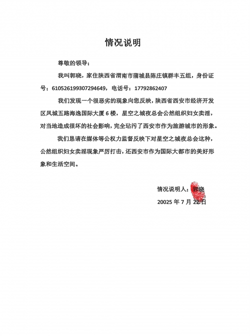 近期,我们不断接到西安市居民的来信,反映西安市经济技术开发区凤城五路人人乐大厦六楼的“星空之城”夜总会存在小姐陪侍和涉黄等不良现象,在当地造成了很坏的