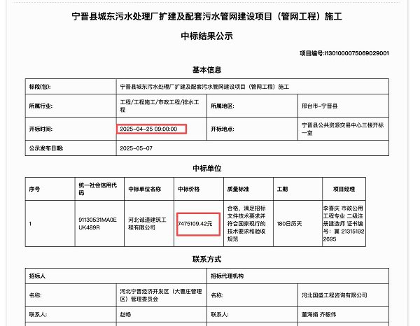 群众质疑:关键审批手续是否缺失?据王先生反映,他关注到“宁晋县城东污水处理厂扩建及配套污水管网建设项目(管网工程)”已于2025年4月25日开标,5月7日发布中标公告,招标人为河北宁晋经济开发区(大曹庄管理区)管理委员会,中标人为河北诚道建筑工程有限公司,中标金额为7475109.42元。