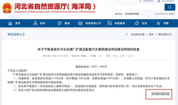 调查发现:招标在前,用地批复在后 通过公开信息查询及向相关部门了解,发现该项目存在时间线上的显著矛盾。 一份名为“关于宁晋县城东污水处理厂扩建及配套污水管网建设项目建设用地的批复”(冀政转征函〔2025〕1009号)的文件显示,批复时间为2025年12月25日。这意味着,该项目的建设用地正式获批时间,远远晚于项目施工招标的2025年4月。