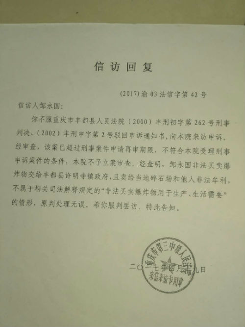 本人对法院的判决一直不服,于2001年4月向丰都县法院申诉,以非法获利的理由驳回;又向涪陵第三中级人民法院申诉,于2017年4月又以非法获利的理由驳回申诉;申诉到重庆高级人民法院,于2017年11月以违反国发(1984)八四5号治安处罚条例的有关规定,和刑法125条的规定,以不符合非法买卖爆炸的司法解释的理由驳回。