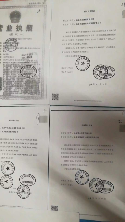 2016年5月16日,华冠商业经营股份有限公司将其持有的北京冠冠零嘴商贸有限公司的股权以50万元,占注册资本的100%转让给北京华冠商贸有限公司。2016年8月5日,华冠商业经营股份有限公司将其持有的在北京龙兴惠民网络科技有限公司的380万元股份,占注册资本的38%转让给北京圆丰投资有限公司。同日,华冠商业经营股份有限公司还将其持有的北京华冠兔网络科技有限公司的1500万元股份,占注册资本的50%转让给北京六孚网络科技有限公司。为达到逃避债务转移财产的目的,华冠商业经营股份有限公司的法定代表人、实际控制人张兵于2016年8月24日注册成立了一个新的公司北京华冠商业科技发展有限公司,任法定代表人,注册资金5000万元,在华冠商业科技公司仅仅成立四天后的8月29日,华冠商业经营股份有限公司又将其持有的北京燕鑫华冠商贸有限公司的300万元股份、北京喜缘多食品有限公司的50万元股份、北京醇荣居食品有限公司的300万元股份、涿州市华冠超市有限公司的2000万元全部转让给北京华冠商业科技发展有限公司。